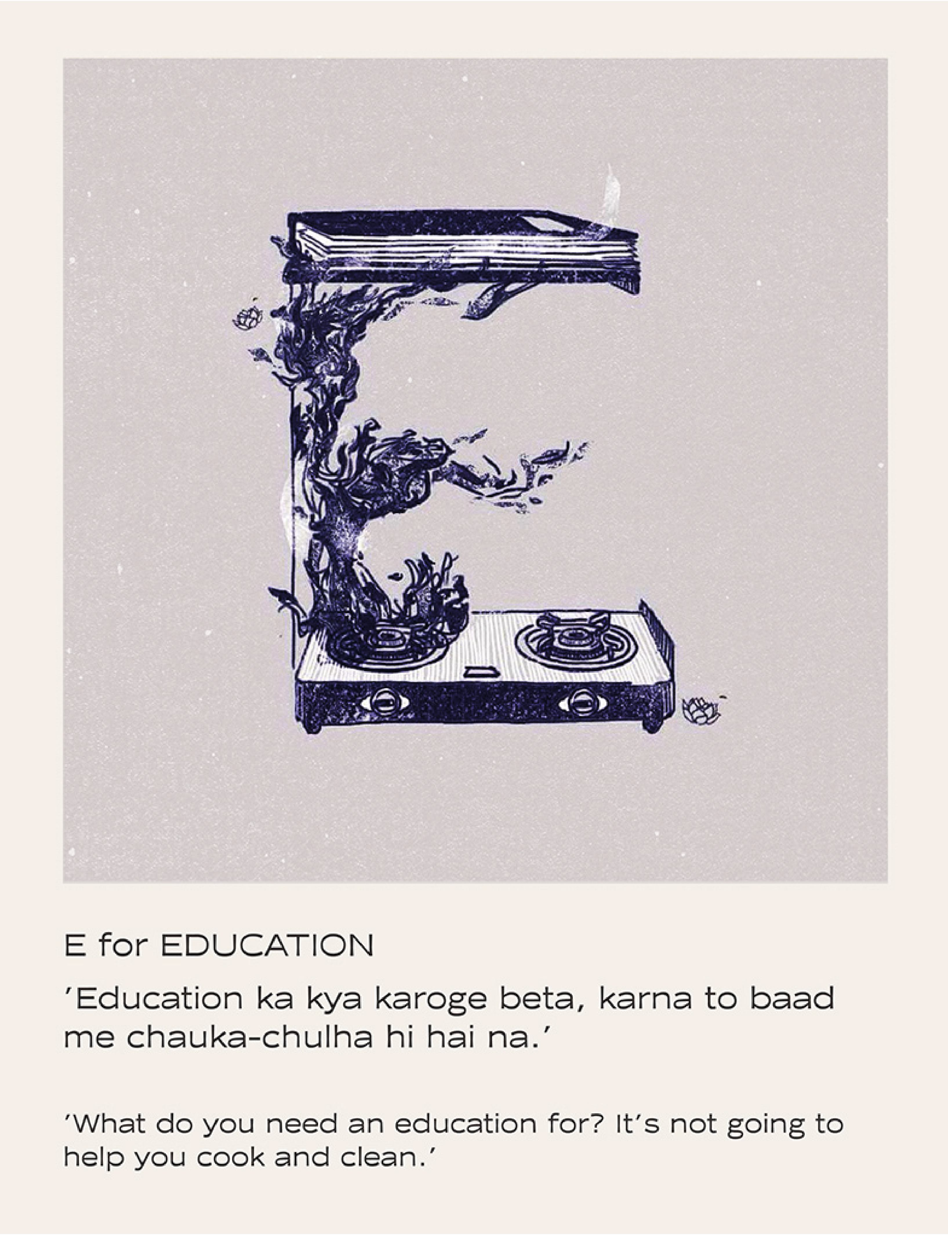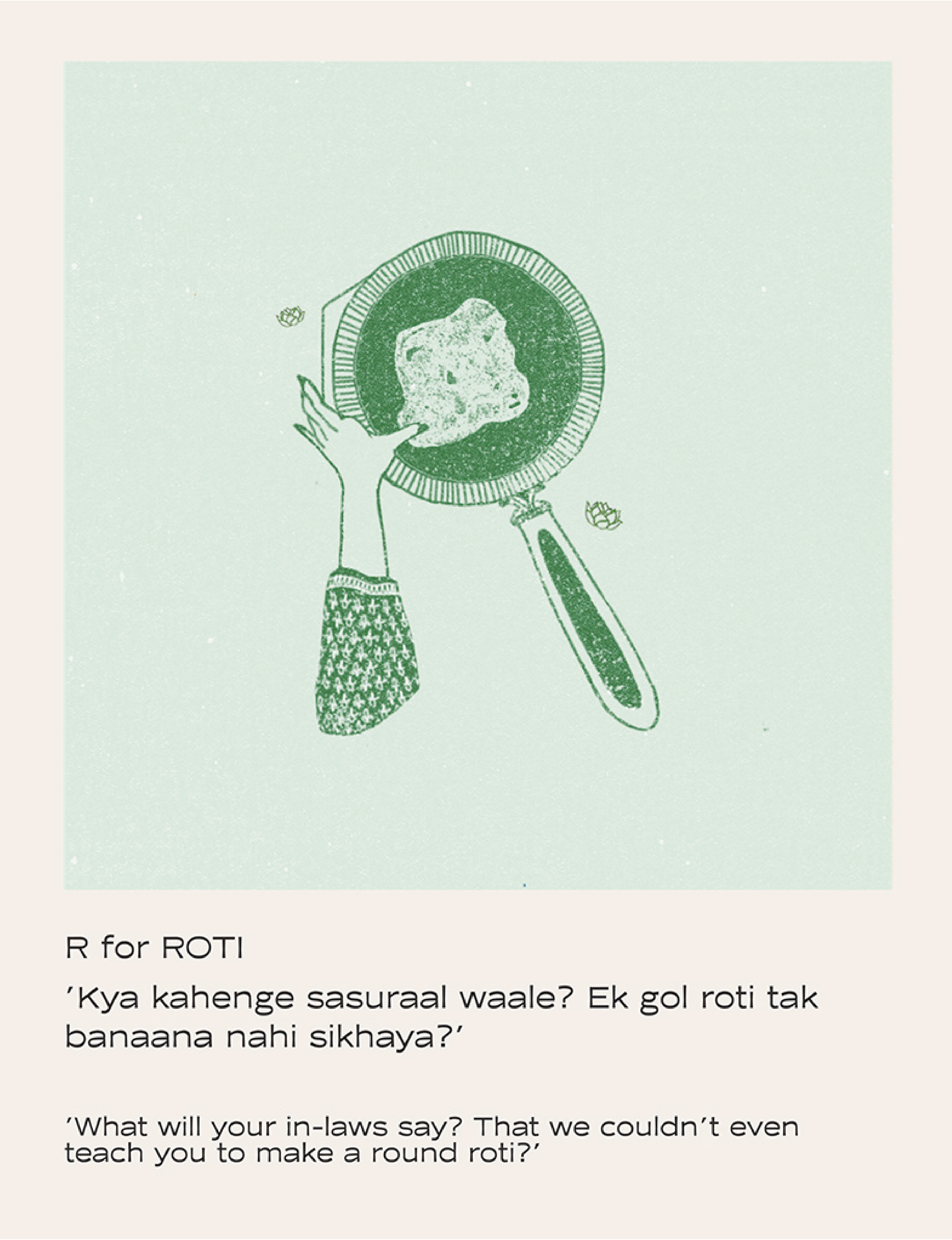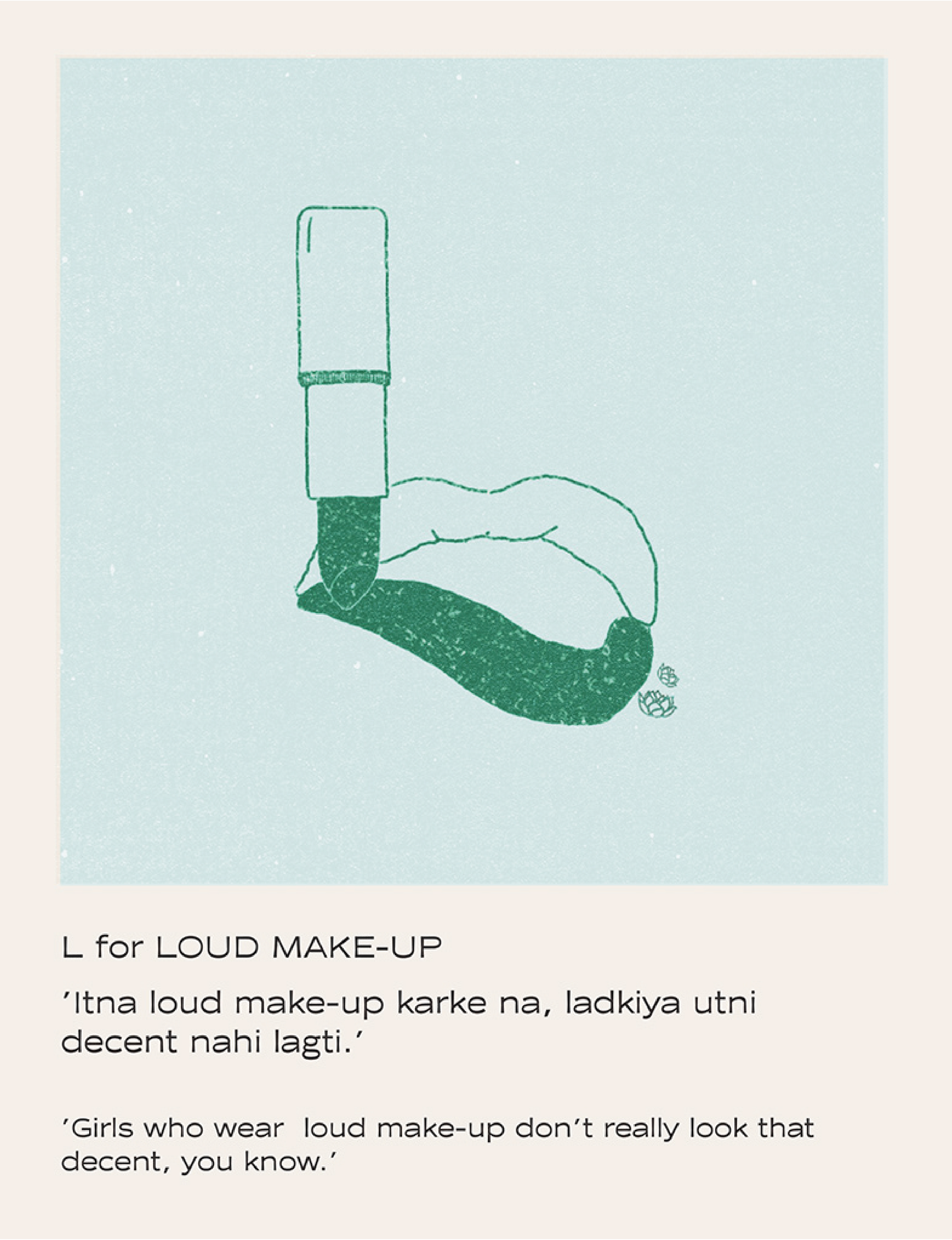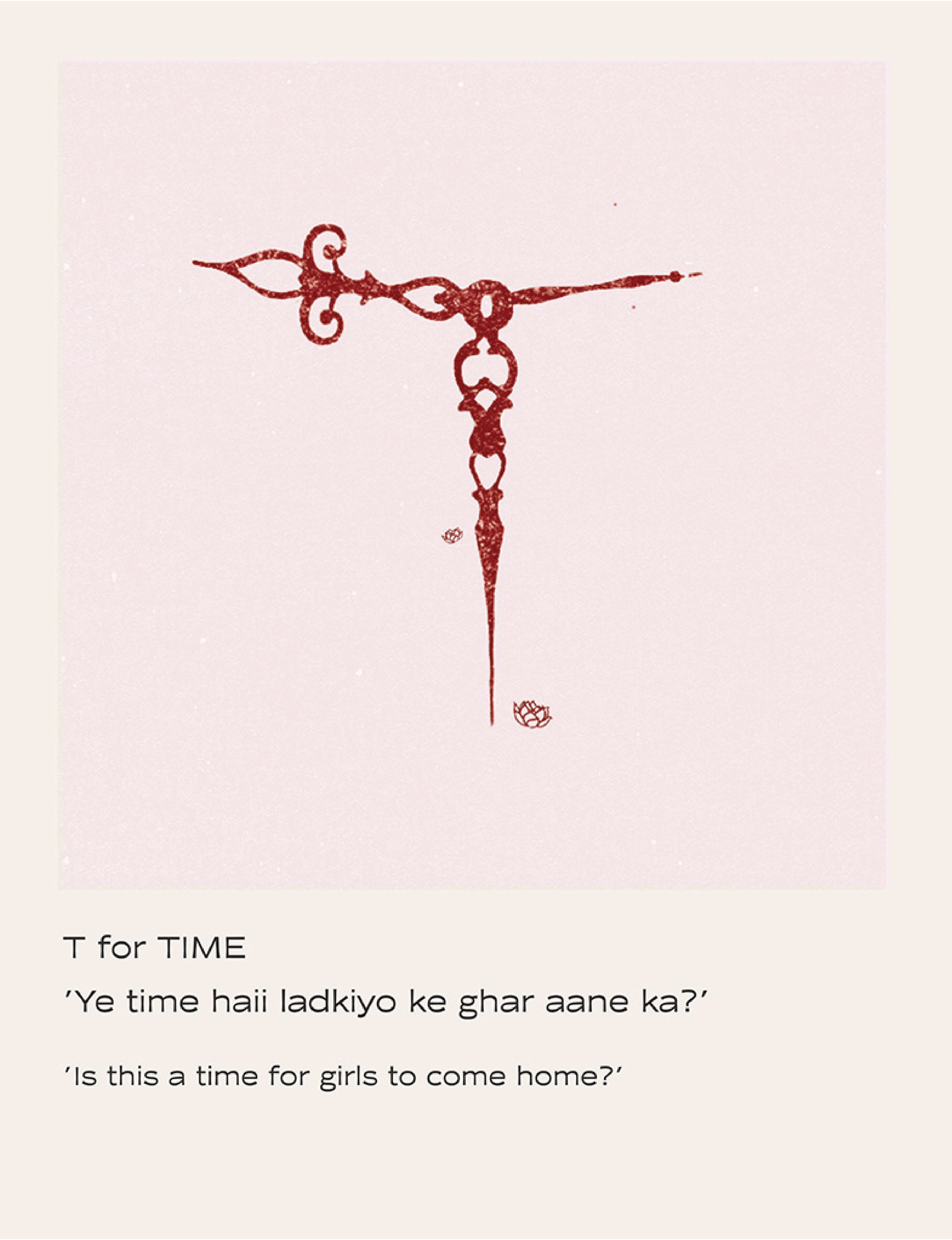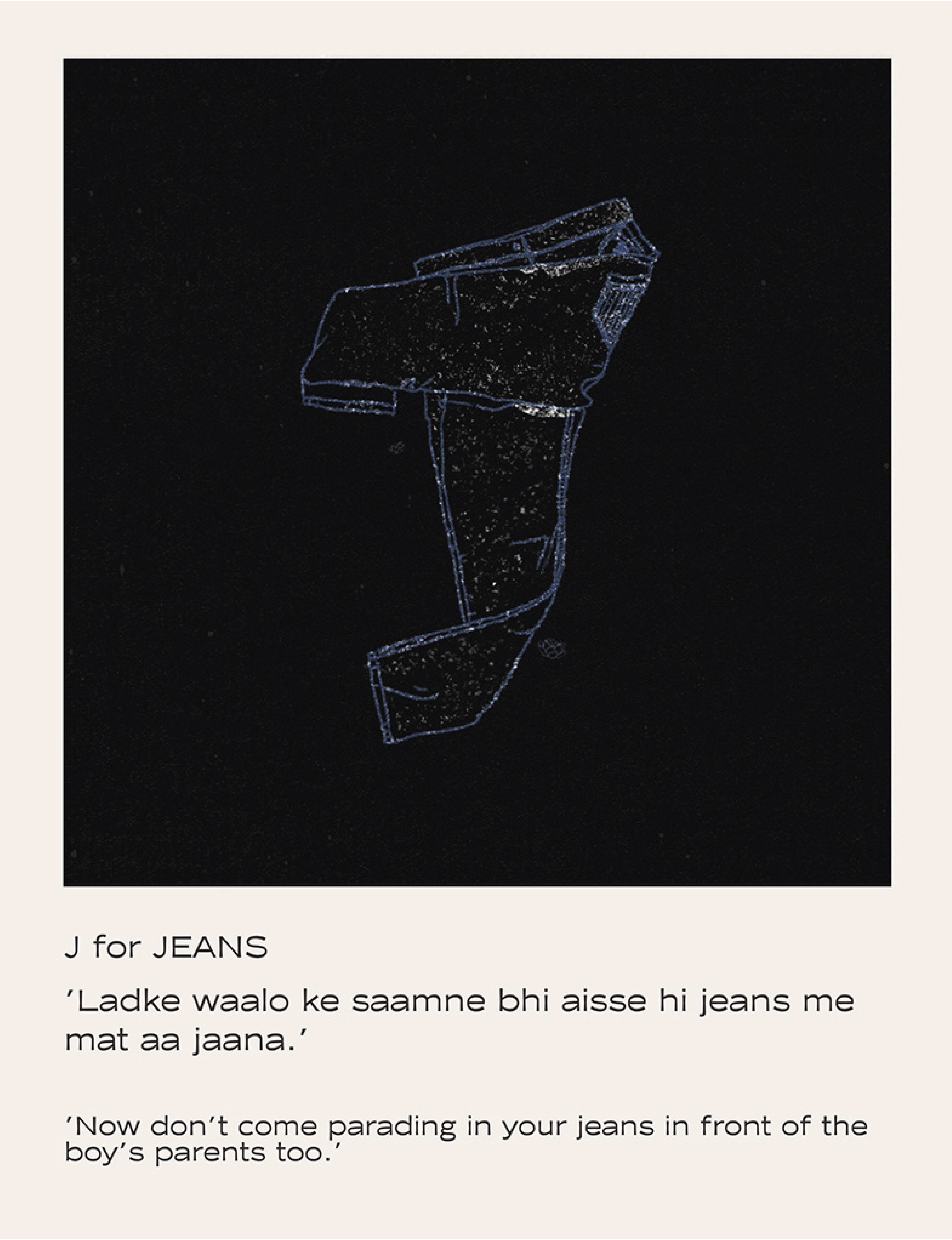 This series of alphabets, then, uses the ever-so-familiar voice of the quintessential Indian “auntyji”, as a relatable representation of our society, and a woman's life growing up and growing old in it.