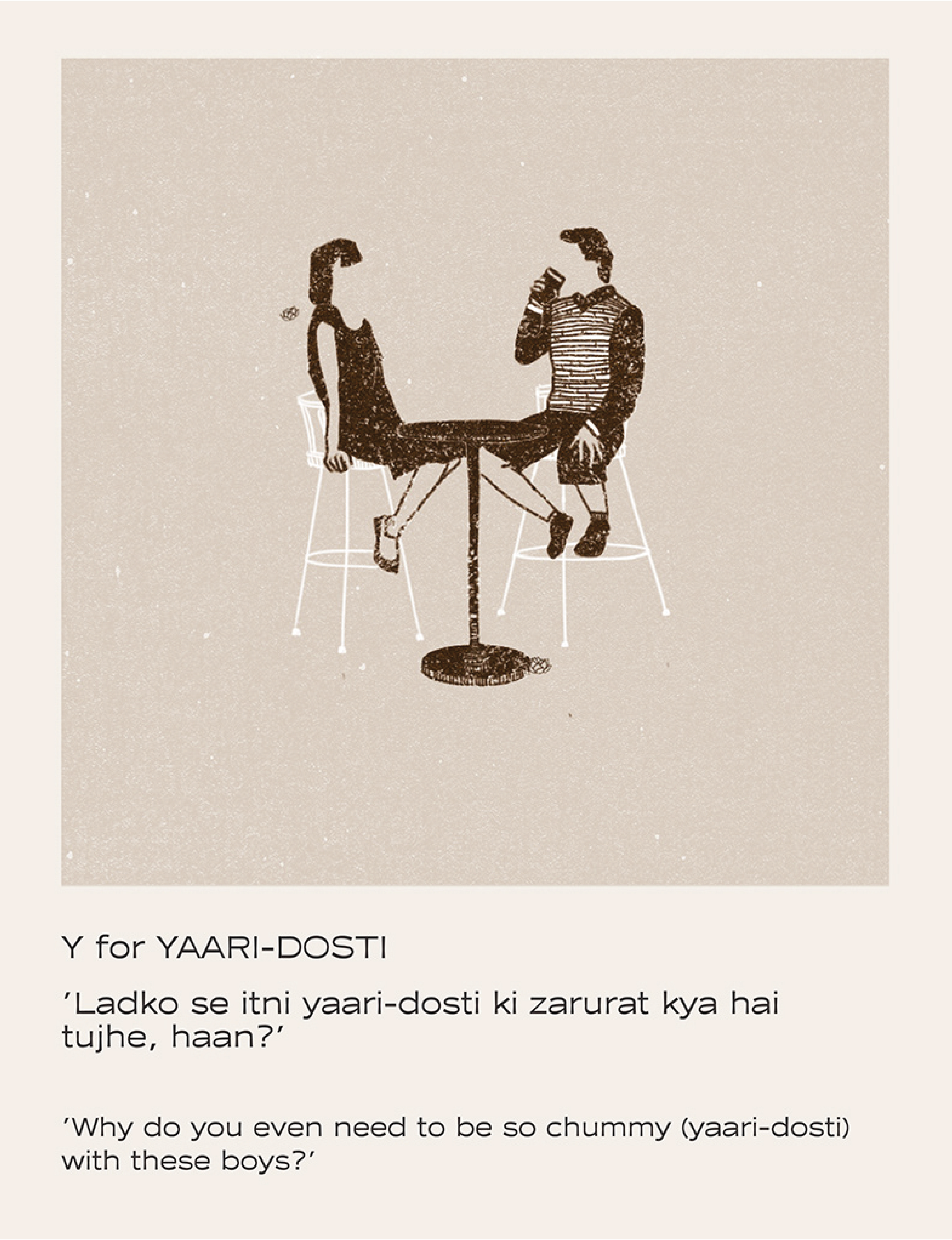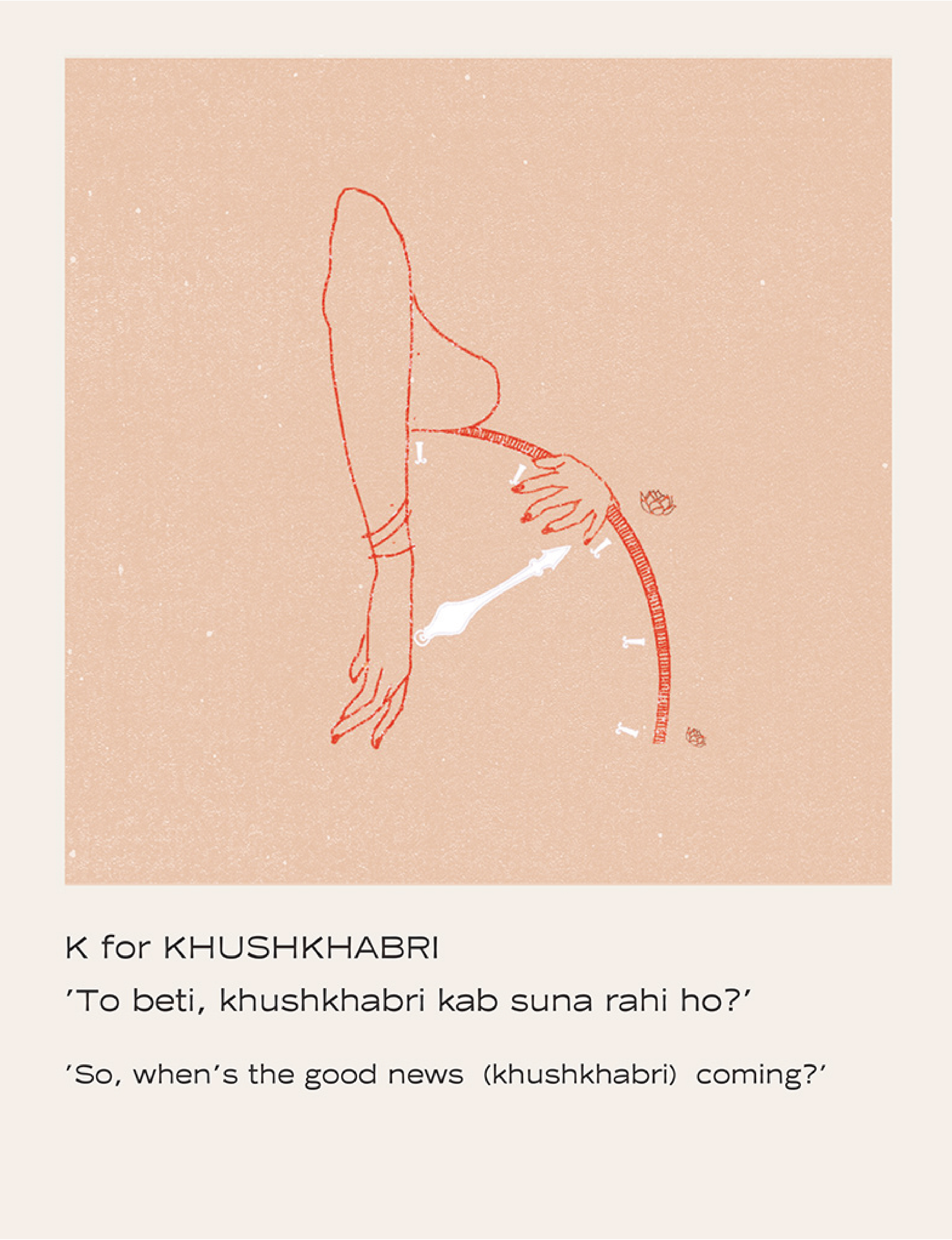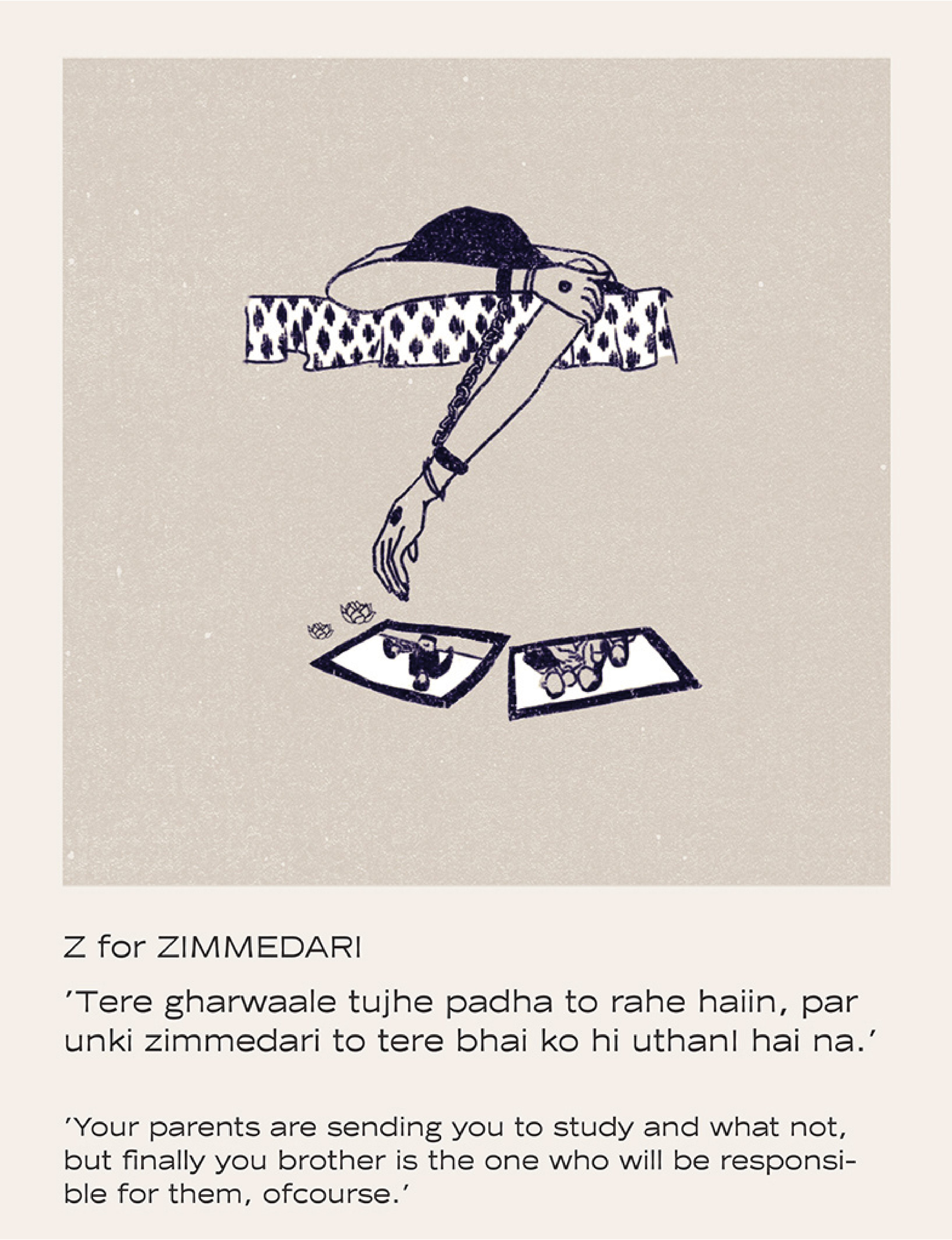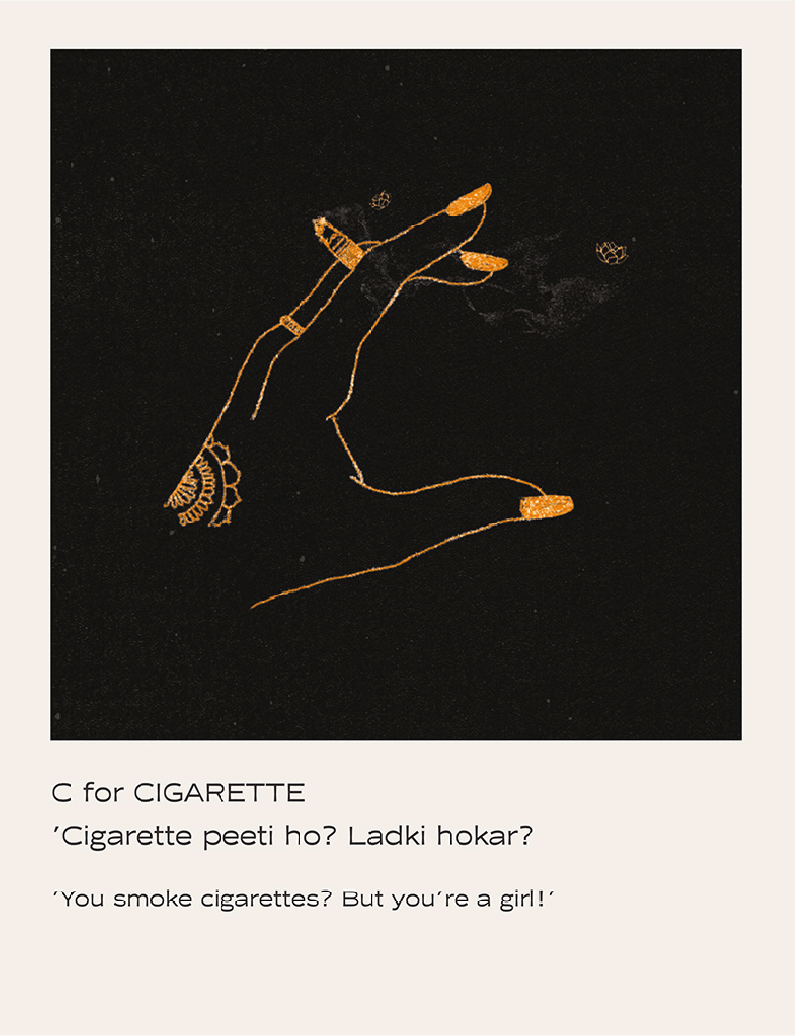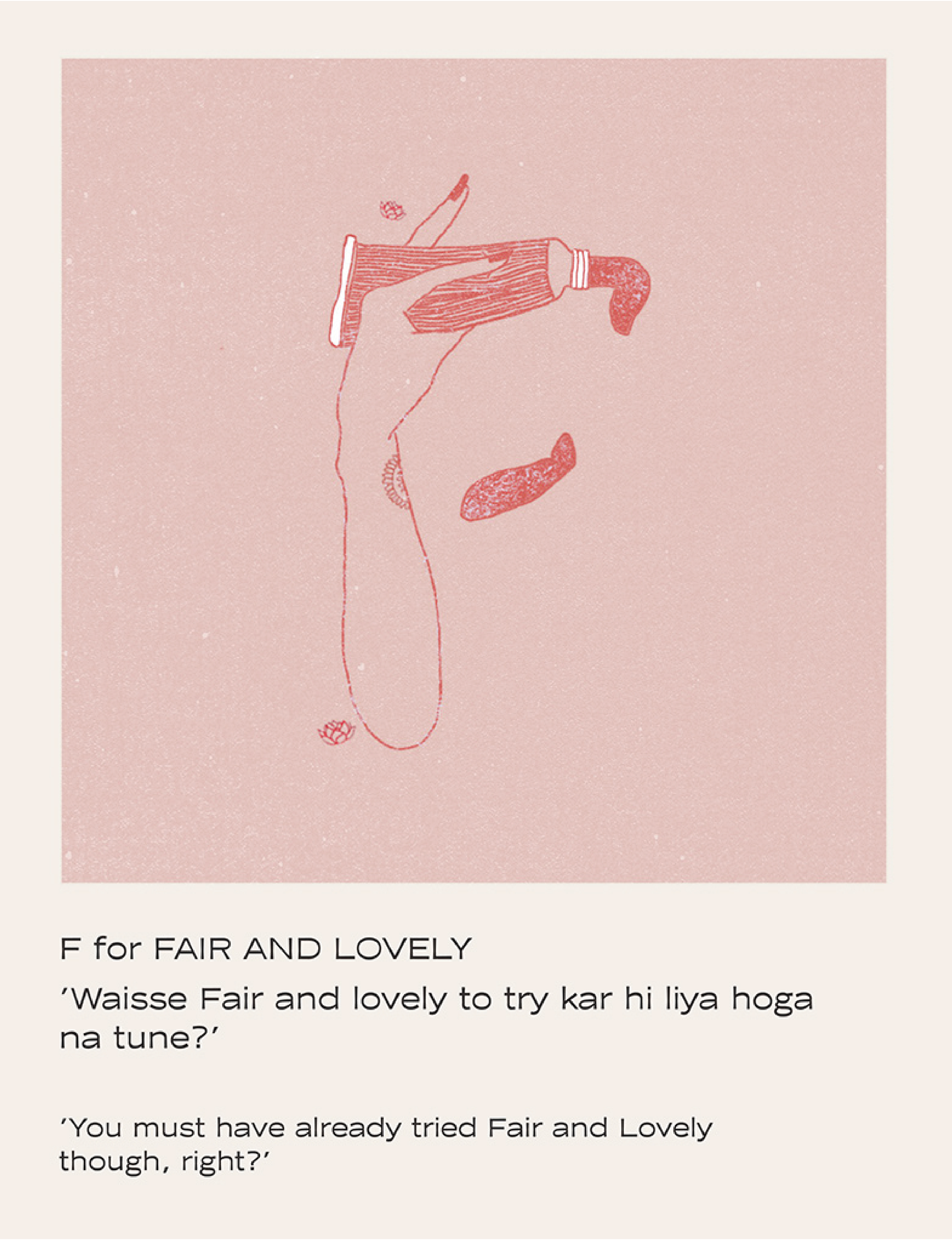 This series of alphabets, then, uses the ever-so-familiar voice of the quintessential Indian “auntyji”, as a relatable representation of our society, and a woman's life growing up and growing old in it.